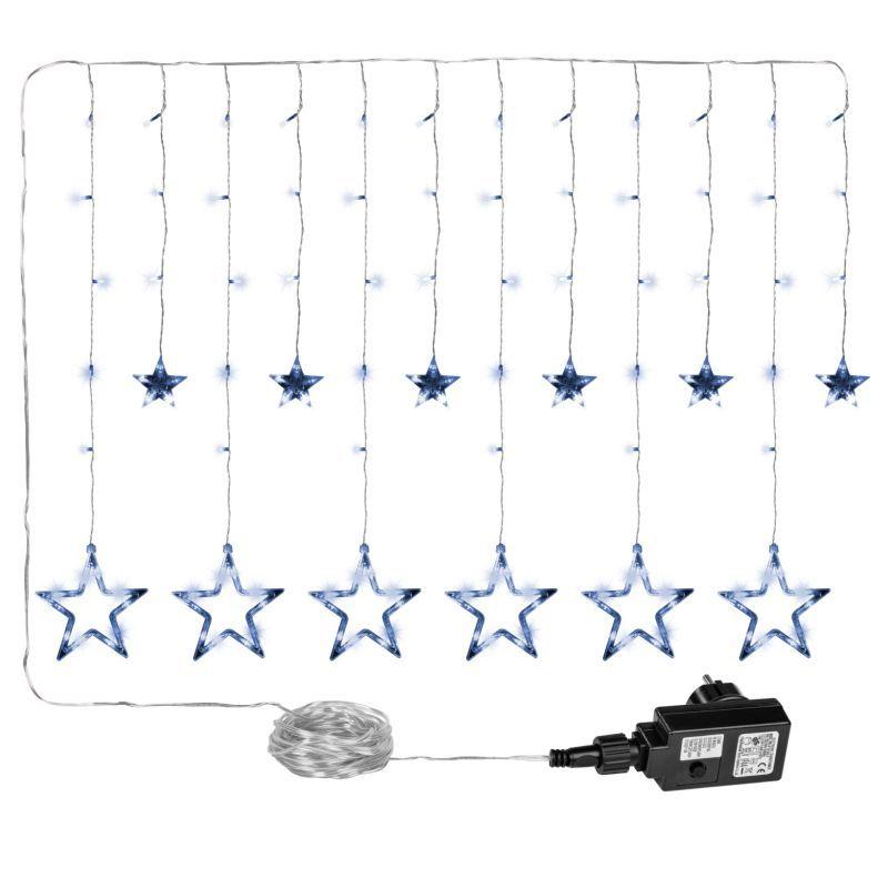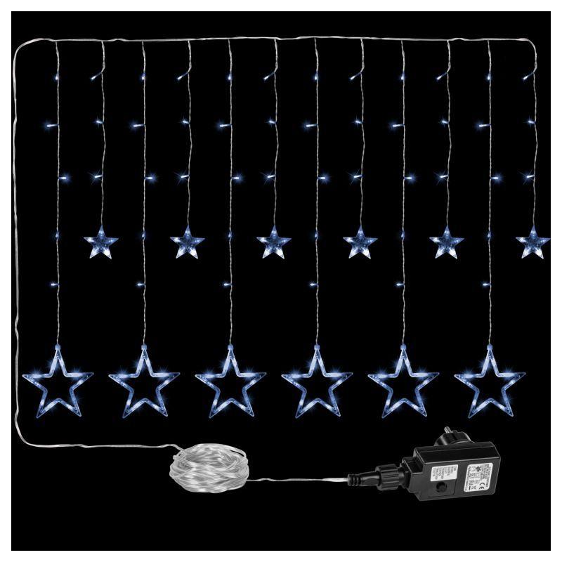 Krásná vánoční dekorace do oken – světelný závěs s hvězdičkami osvětlenými celkem 150 kusy LED diod, které svítí studeně bílým světlem. Diody mohou trvale svítit nebo různě blikat v závislosti na Vámi nastaveném programu. Rozměry 2x1 m (šířka x výška).
