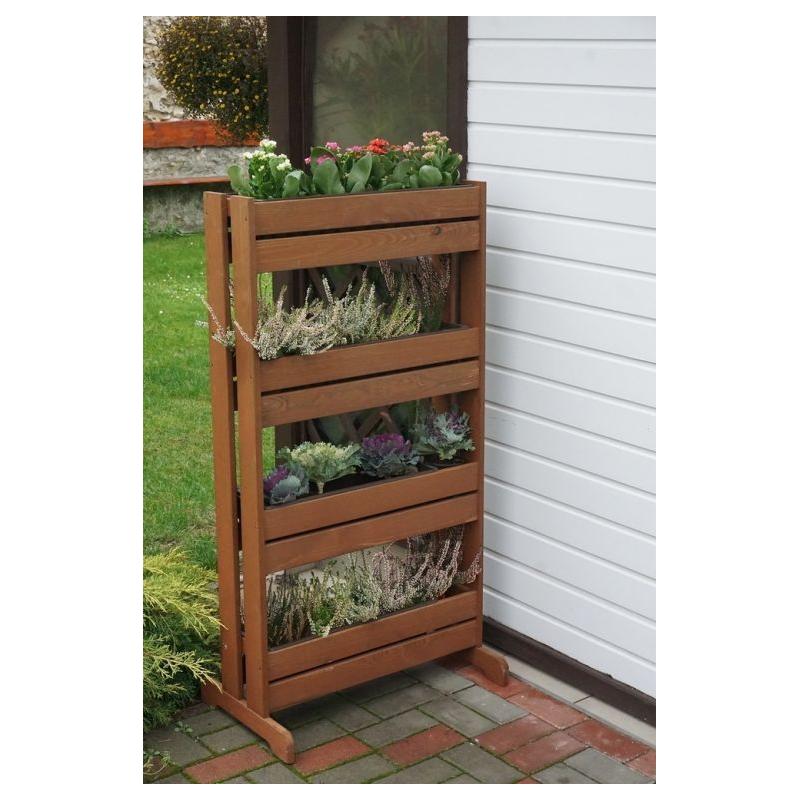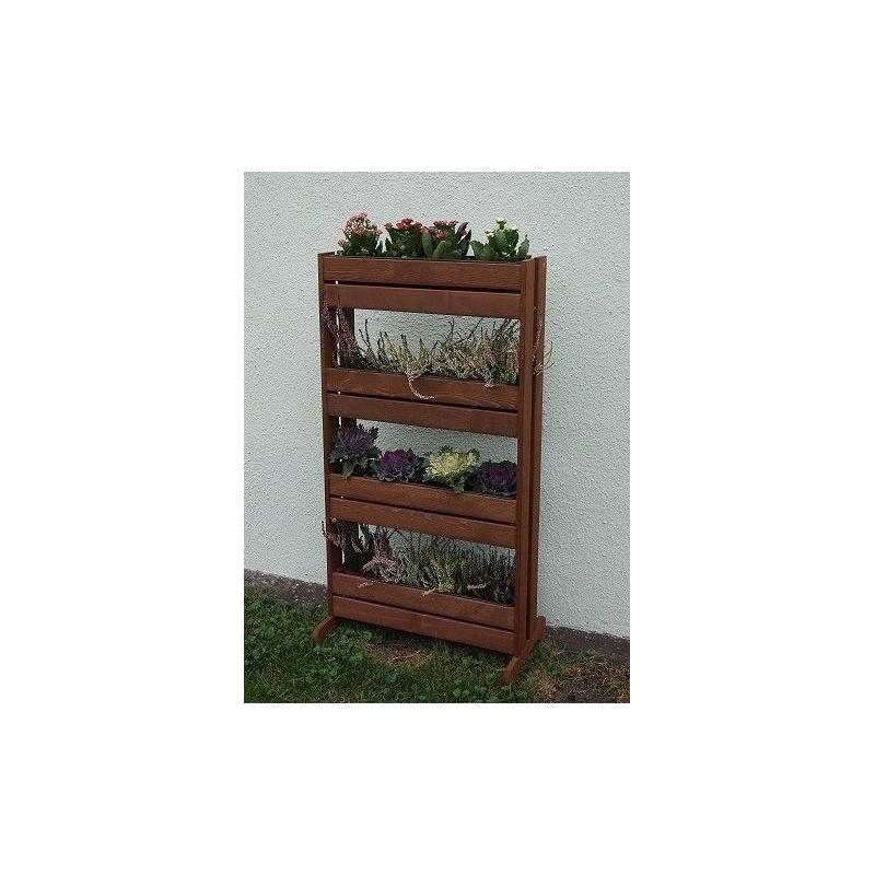 Vysoký dřevěný stojan na květináče a truhlíky v tmavě hnědé barvě, který umožňuje pomocí kvetoucích rostlin vytvořit designové odstínění prostor – doporučujeme na balkony, terasy, ale i kamkoliv na zahradu. Výška 125 cm, šířka 55 cm.