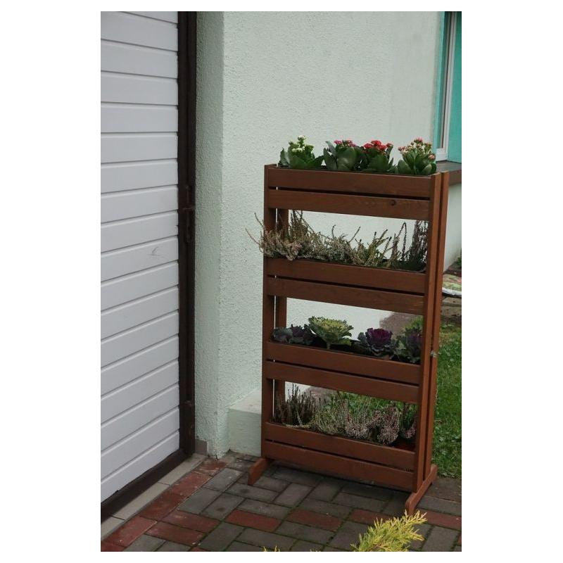Stojan má celkem 4 police a je vyrobený z masivního borovicového dřeva, které je lakované pro větší životnost ve venkovních prostorech.