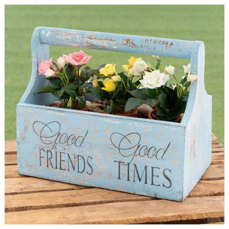Dřevěný ozdobný box v retro vzhledu který můžete využít jako samostatnou dekoraci například v bytě nebo v obchodě, případně jako funkční doplněk na přenášení vína, květin, nejrůznějších drobností apod. Délka 30 cm. Provedení ve světle modré barvě. Můžete jej také užít jako ozdobný obal na květiny.