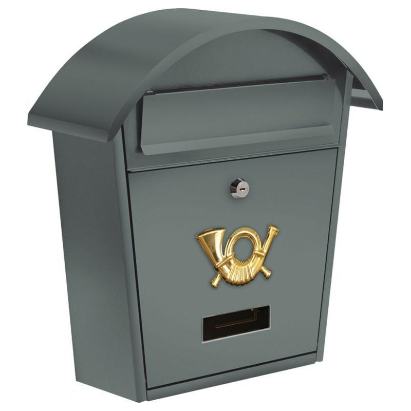 Nástěnná poštovní schránka vhodná především pro rodinné domy. Přitažlivé provedení šedé barvy s oblou stříškou, krytem vhozového otvoru, zámkem a okénkem na jmenovku.