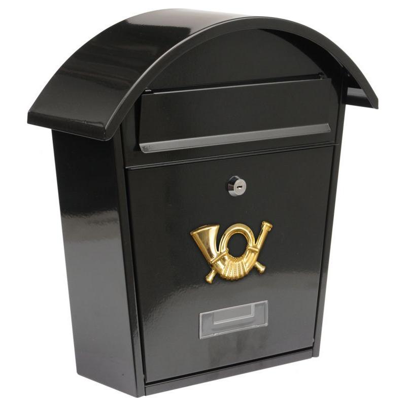 Nástěnná poštovní schránka vhodná především pro rodinné domy. Přitažlivé provedení černé barvy s oblou stříškou, krytem vhozového otvoru, zámkem a okénkem na jmenovku.