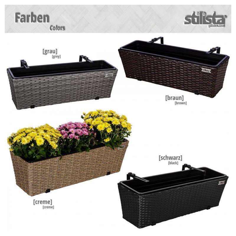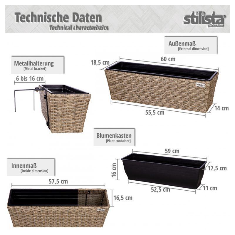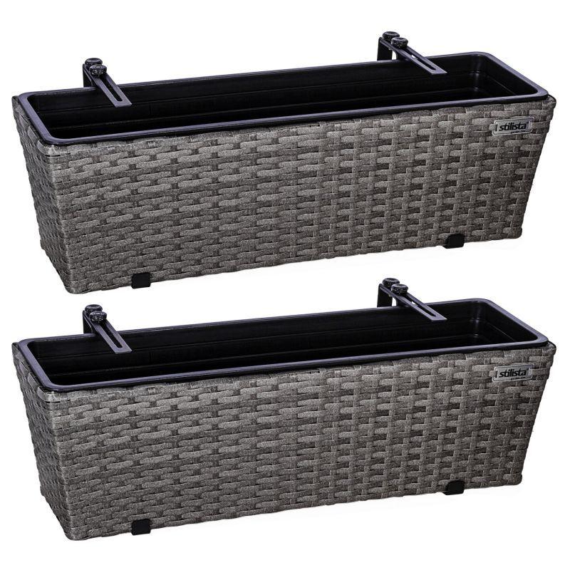 Sada 2 truhlíků na květiny z umělého ratanu včetně vnitřních vyjímatelných nádob a závěsů pro zavěšení na zábradlí. Provedení v šedé barvě. Rozměry 60x16x19 cm.