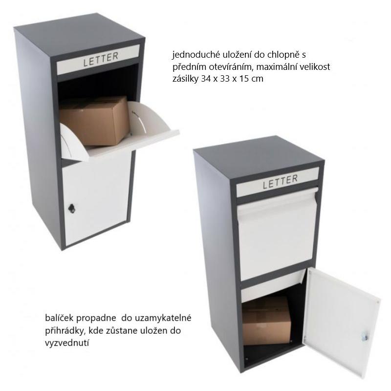 Promyšlený systém vhozu balíků. Balík propadne do spodní části, kde ho můžete následně vybrat po odemčení schránky.