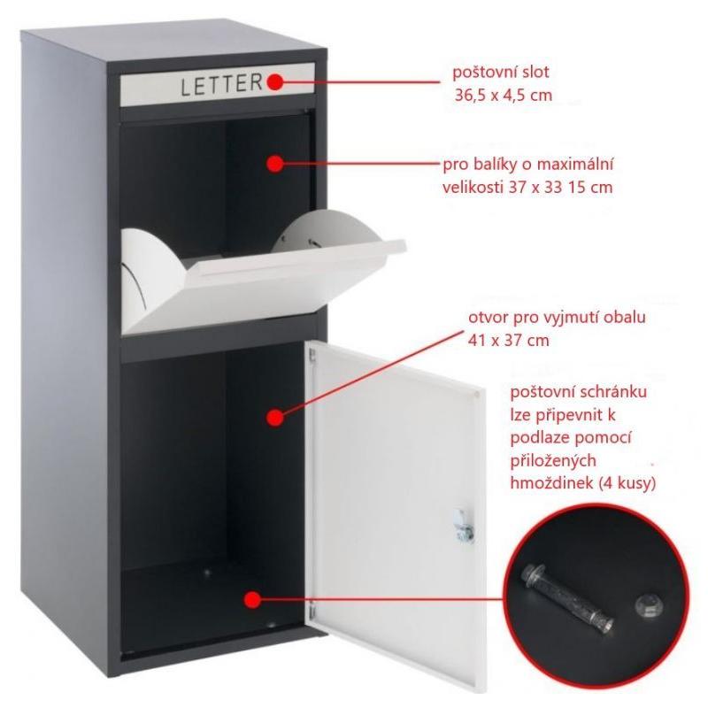 Součástí jsou 4 kovové hmoždinky, kterými můžete schránku připevnit k podlaze.