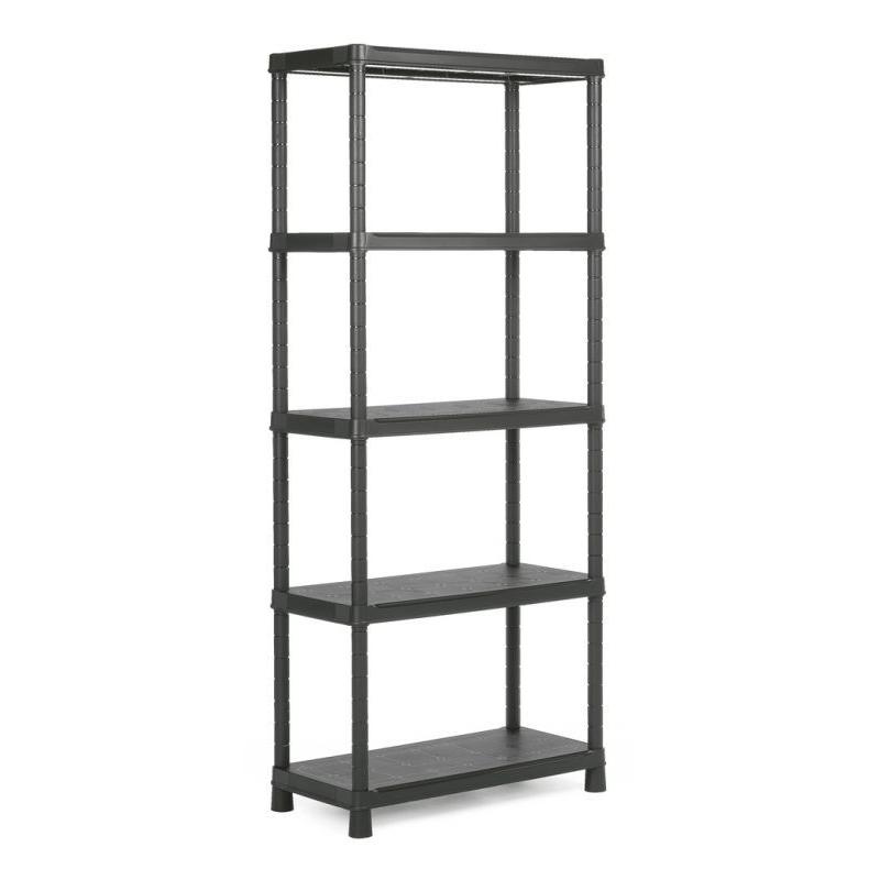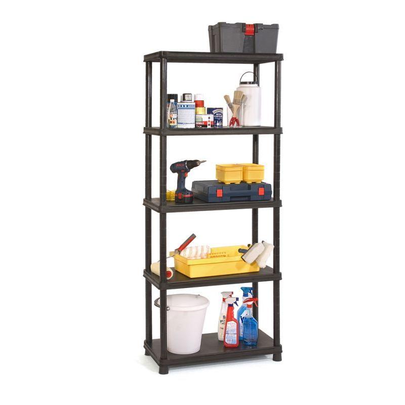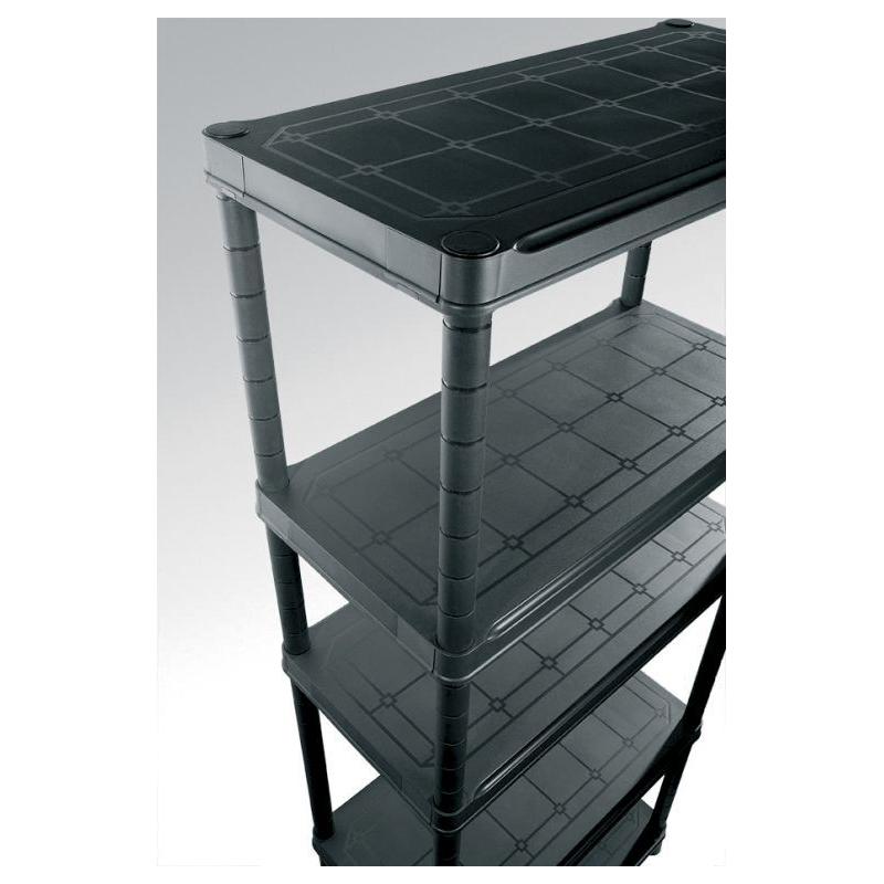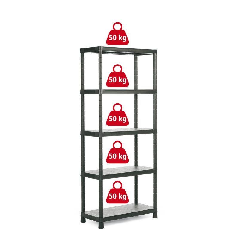 Praktický plastový regál ve větším provedení vhodný např. do dílny, garáže, komory, sklepa apod. Vysoká celková nosnost 250 kg (50 kg / police), které je dosaženo díky pevnému, profilovanému plastu.
