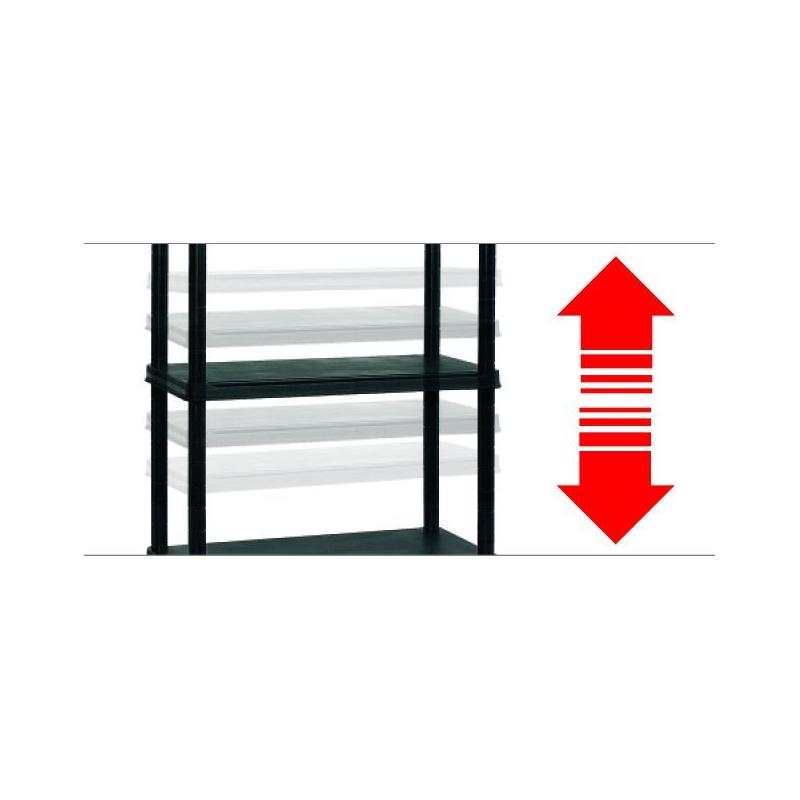 Výhodou je možnost výškového posouvání polic, takže lze pohromadě skladovat malé i velké předměty bez velkých nevyužitých prostor.