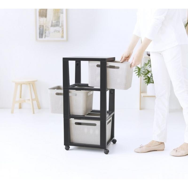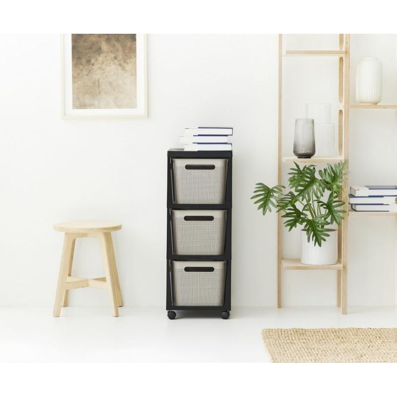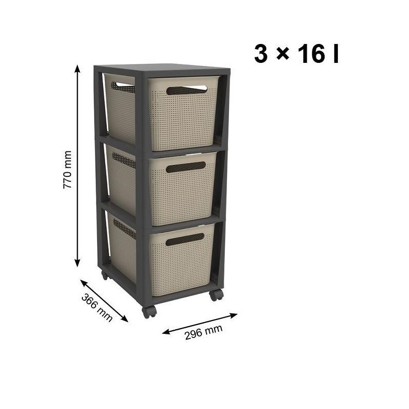 Plastový regál na kolečkách se 3 úložnými boxy v děrovaném designu pro umožnění přístupu vzduchu. Provedení o objemu 3x16 litrů s rozměry 29,6x36,6x77 cm. Kombinace barev antracit a cappuccino.