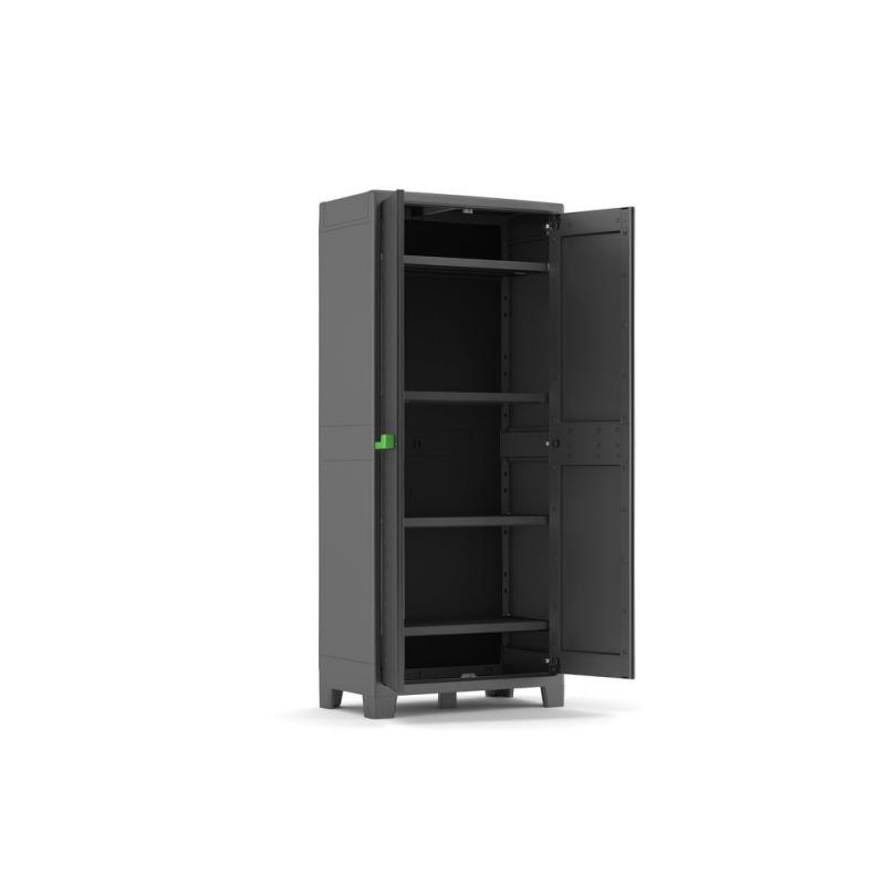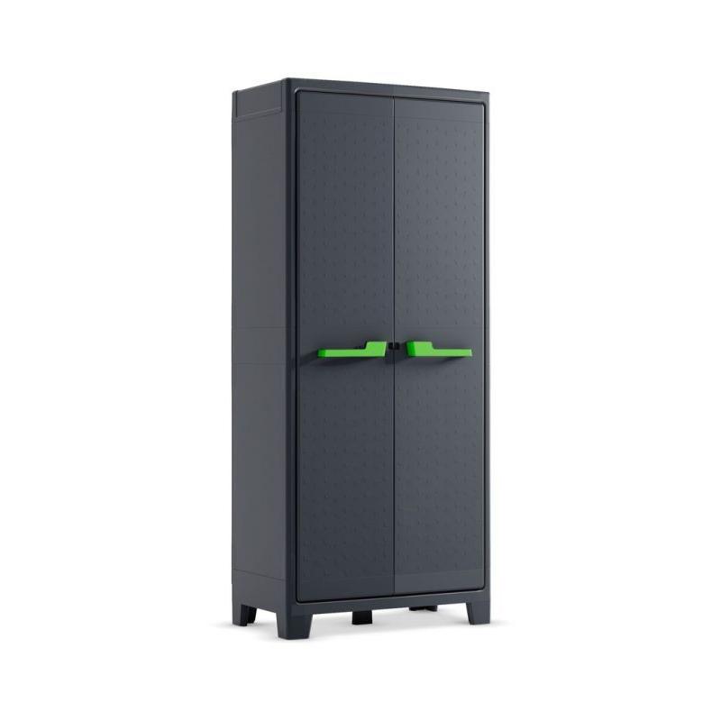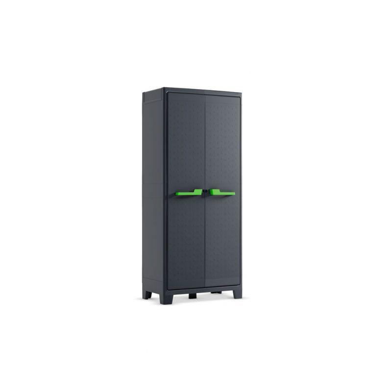 Vysoká plastová skříň s uzamykatelnými dvířky vhodná pro uložení nářadí a nejrůznějších dílů, případně i jako šatní skříňka v dílnách, šatnách, garážích, uchování věcí na terase apod.