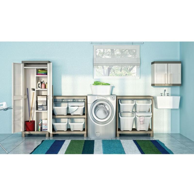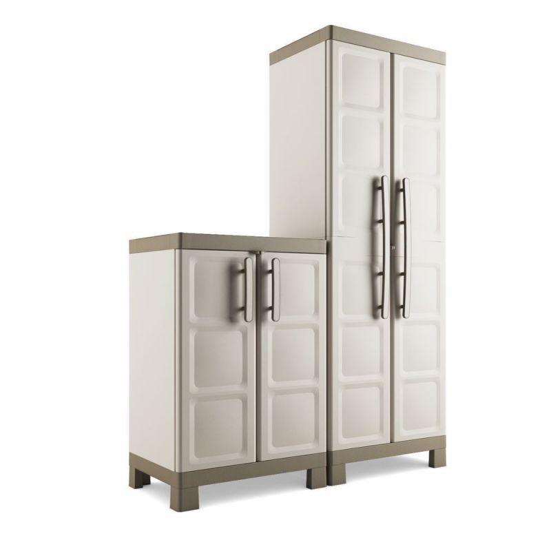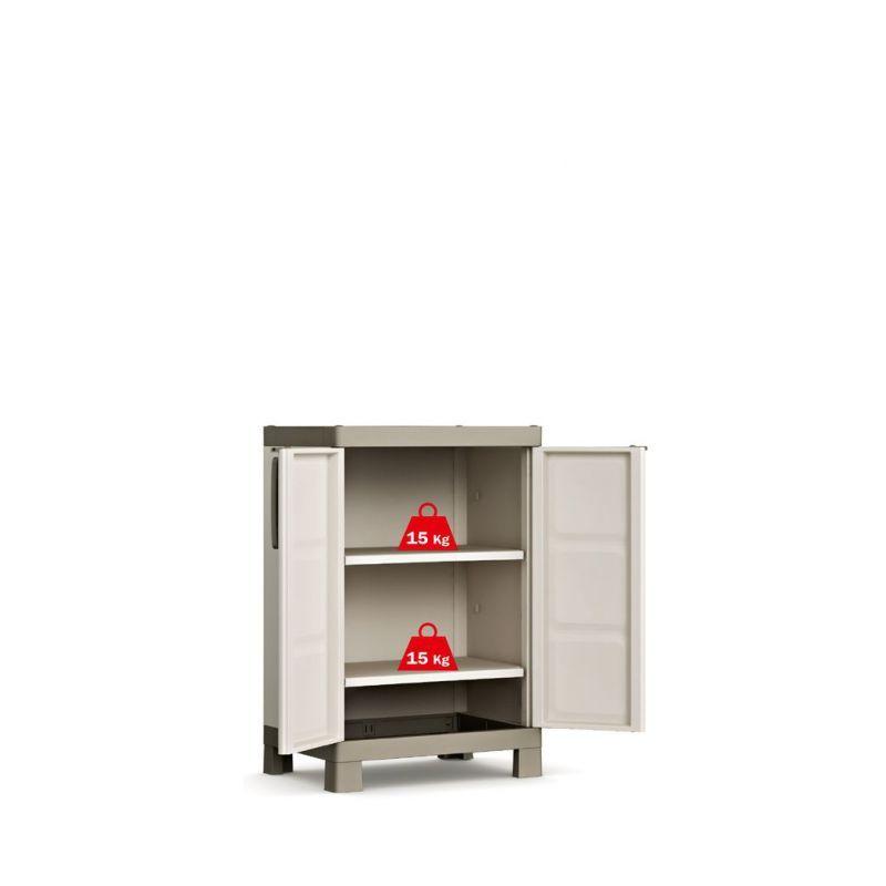 Nižší plastová skříňka s uzamykatelnými dvířky vhodná pro uložení nářadí a nejrůznějších dílů v garážích a dílnách, ale díky propracovanému designu a příjemným barvám je vhodná i do obytných prostor, případně na terasu.