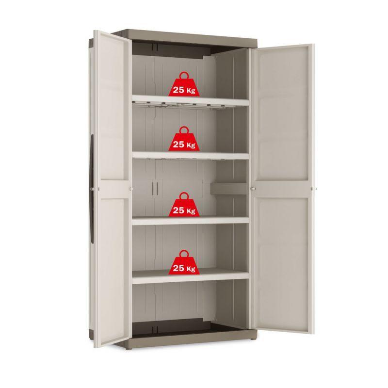 Vysoká plastová skříň v elegantním provedení- kombinace béžové a světle hnědé barvy. Vhodná především do míst s vysokou vlhkostí, rizikem záplav apod. (dílny, sklepy, koupelny, terasa...). Tato skříňka je vhodná i do exteriéru, ale v takovém případě ji přes zimu schovejte do krytého prostoru, nebo zakryjte vhodnou plachtou. Výška 181 cm.