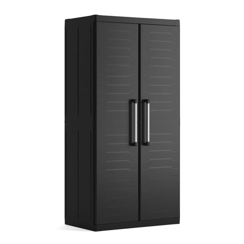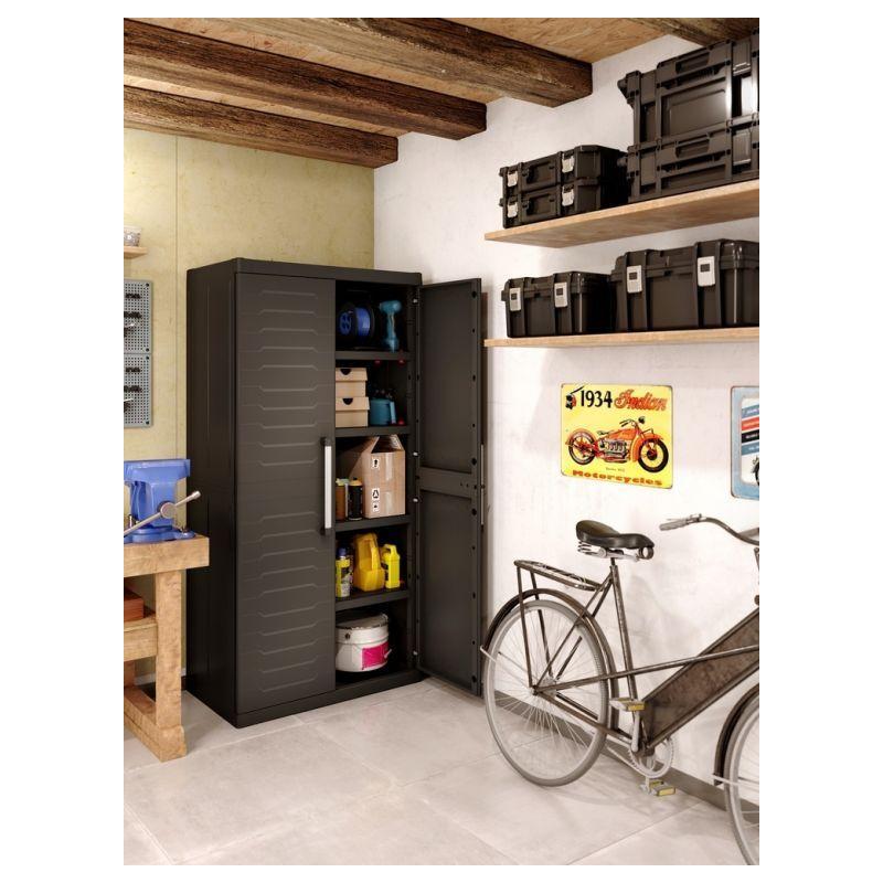 Vysoká černá plastová skříňka vyrobená z plastu, díky čemuž je vhodná do vlhkých, nebo jinak náročných prostor- např. do dílny, gará ... Více v detailním popisu níže.