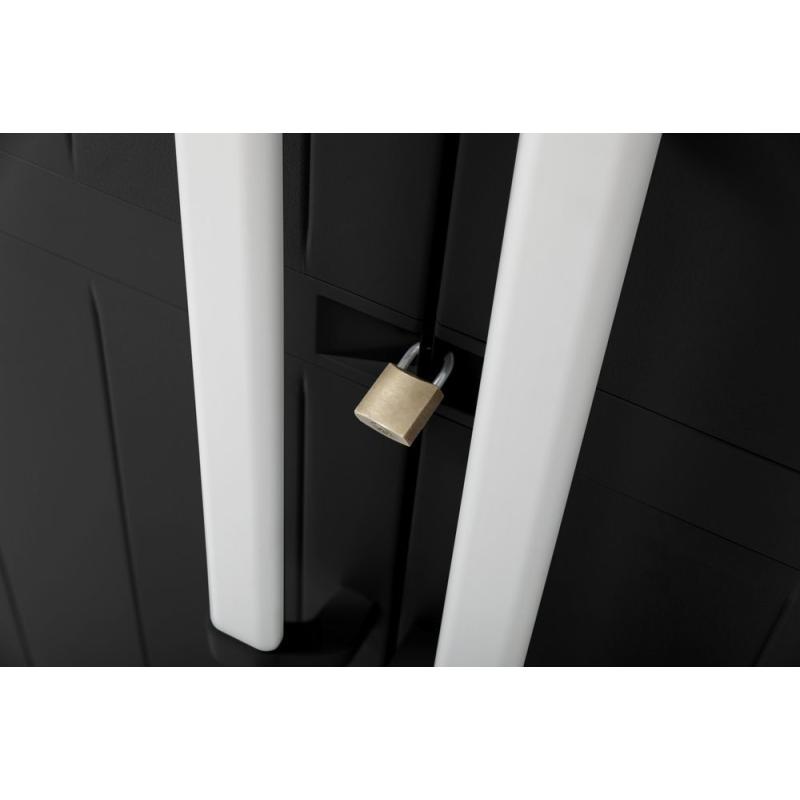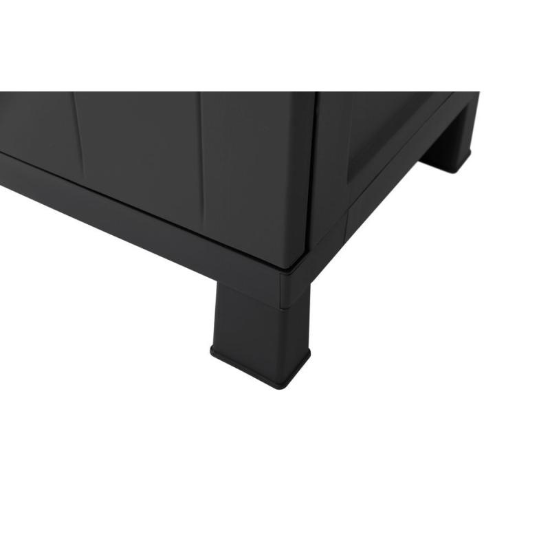 Kvalitní vysoká plastová skříň s dvoukřídlými otočnými dveřmi, která určená do náročnějších vnitřních a zastřešených venkovních prostředí. Součástí skříňky jsou 4 výškově nastavitelné police s nosností 20 kg / police. Provedení v černé barvě se stříbrnými hliníkovými rukojeťmi o celkových rozměrech 65x173x37 cm (šířka x výška x hloubka).