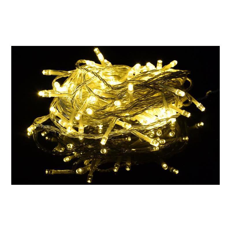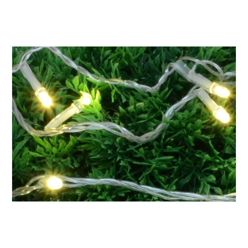 Svítící řetěz z LED diod s délkou 10 m s celkovým počtem 100 LED diod svítící teple bílým světlem. Napájení bateriemi – řetěz je vhodný především v místech, kde nemáte přístup ke zdroji el. energie, nebo nechcete hyzdit okolí přívodními kabely. Časový spínač tento LED řetěz automaticky zapne a následně vypne dle Vašeho nastavení (je možno nastavit časové období, kdy se má řětěz zapnout a kdy opět vypnout).