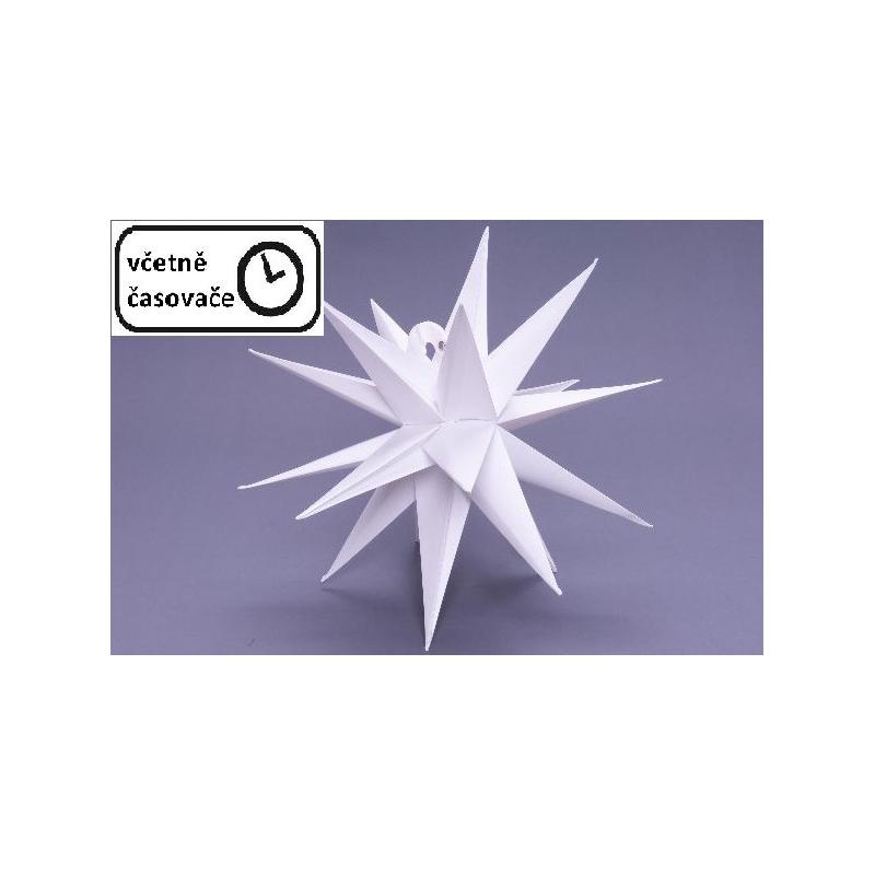 Vánoční dekorativní hvězda k zavěšení / postavení kamkoliv do interiéru vyrobená z kvalitního a odolného PVC bílé barvy. Hvězda je osvětlená 10 úspornými LED diodami, které jsou napájeny třemi bateriemi AA (klasické tužkové). Průměr hvězdy 35 cm. Určeno pouze pro vnitřní (interiérové) použití. Možnost automatického zapínání a vypínání pomocí vestavěného časovače.