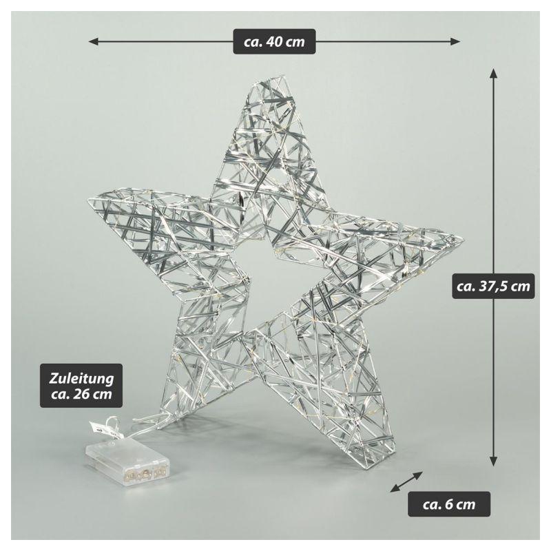 Krásná vánoční svítící hvězda ve 3D provedení, kterou můžete jednoduše postavit kamkoliv do interiéru- obzvláště hezky působí na parapetu, skříňce, nebo na stole. Je vyrobena z platu v kombinaci se stříbrným drátem, na kterém jsou umístěné úsporné led diody. Určená pouze pro vnitřní použití. Vybavená časovačem. Napájení na baterie (3xAA- klasické tužkové). Rozměry hvězdy jsou 37,5x40x6 cm.
