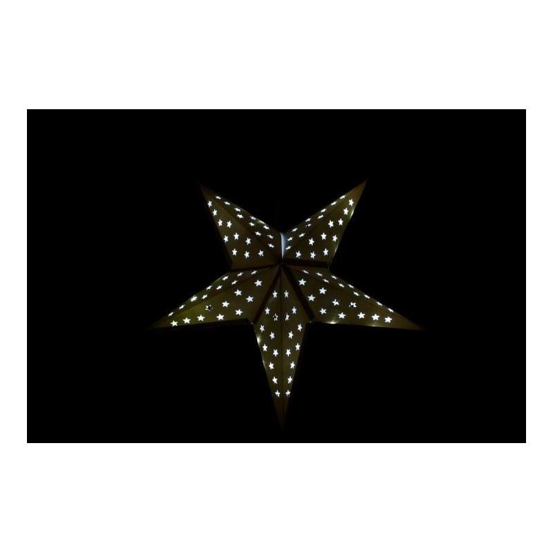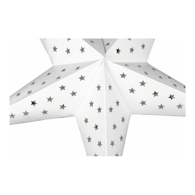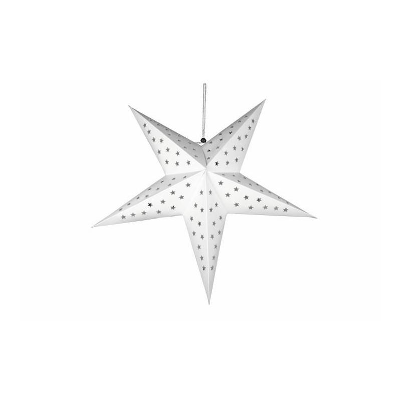 Ozdobná papírová vánoční hvězda o průměru 60 cm s osvětlením uvnitř. Provedení v elegantní bílé barvě. Po zapnutí světlo proniká ven malými hvězdičkami vyřezanými v materiálu.