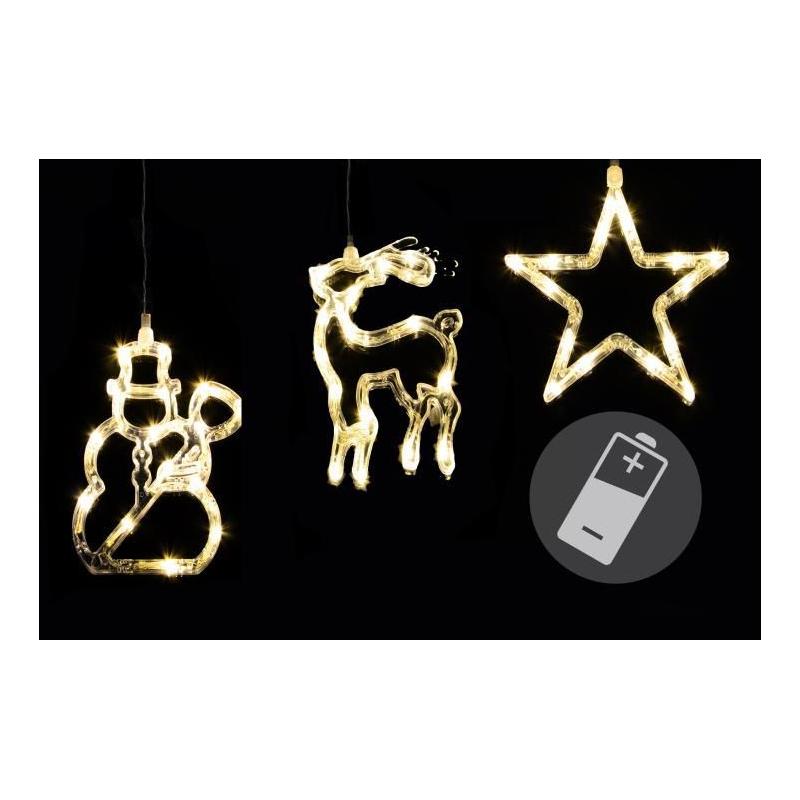 Sada 3 kusů závěsných svítících dekorací (sněhulák, sob, hvězda) výšky 20 cm vyrobené z plastu. Napájení na 3 AAA baterie, takže je možno použít dekoraci i mimo dosah zásuvek – je určena především na okna, ale je možno umístit ji i na stěnu, dveře apod. Materiál obsahuje svítivé LED diody, které po zapnutí rozzáří figurky i blízké okolí.
