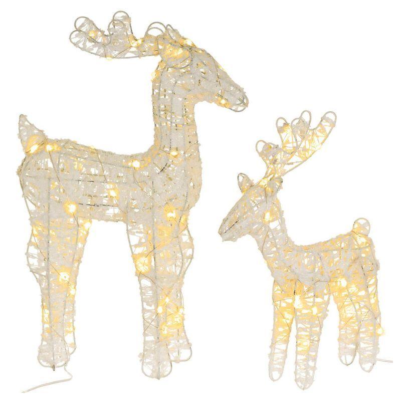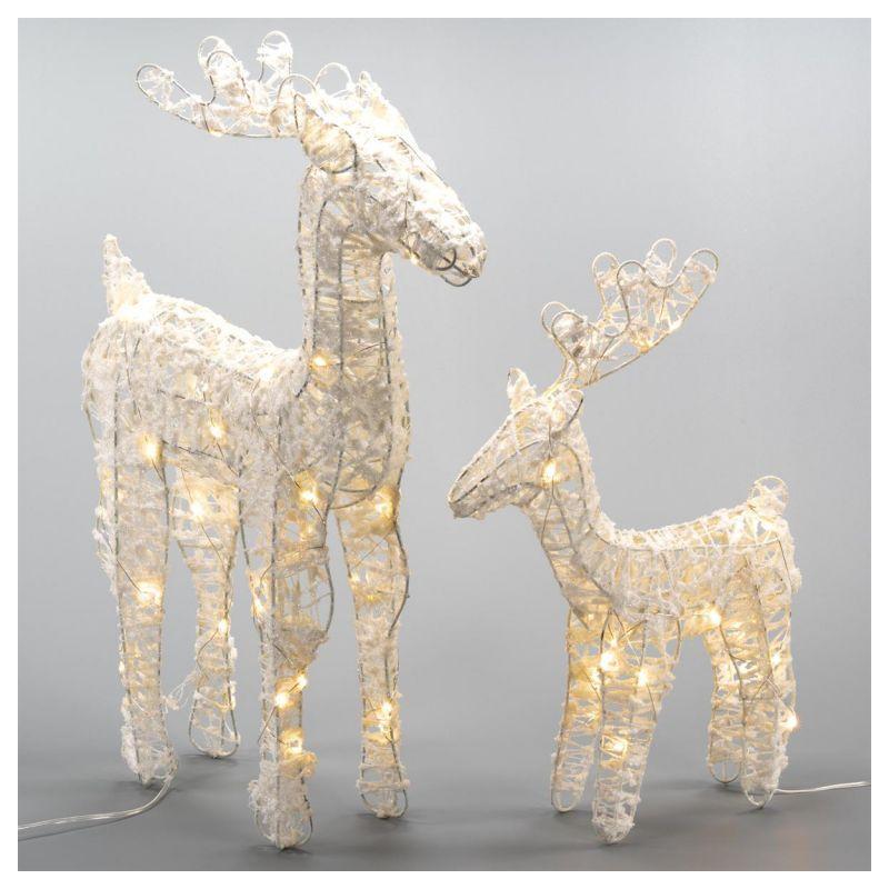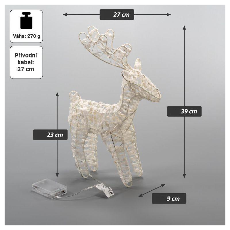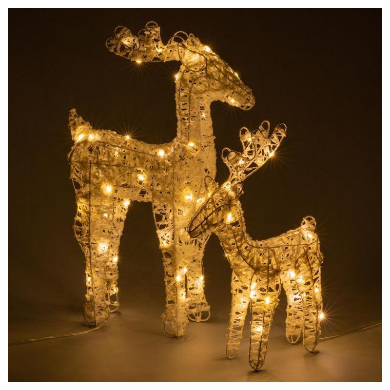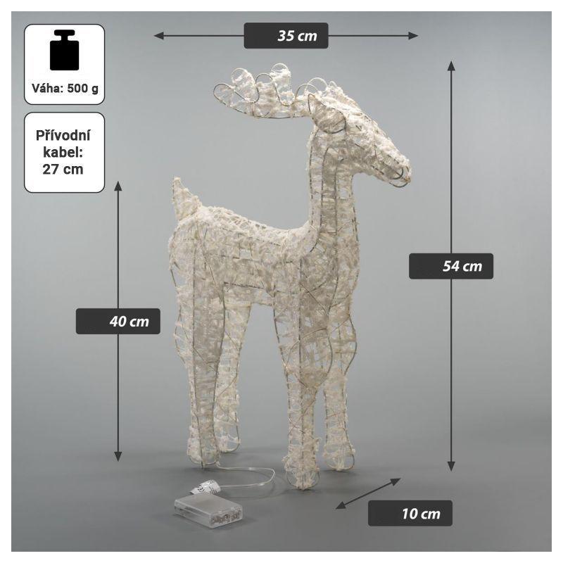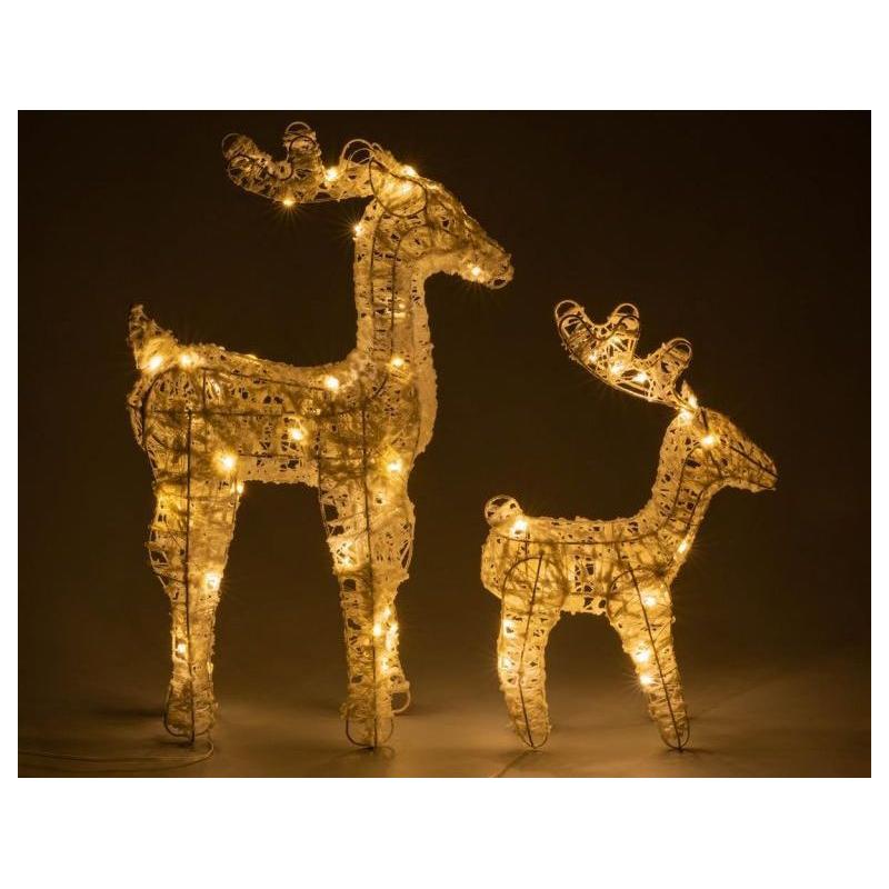 Sada 2 vánočních figurek sobů pro vnitřní interiérové použití. Provedení o výšce 54 a 39 cm svítící teple bílou barvou. Osvětlení je napájeno bateriemi, takže ho můžete umístit opravdu kamkoliv v bytě bez nutnosti řešit přístup k elektrické zásuvce.