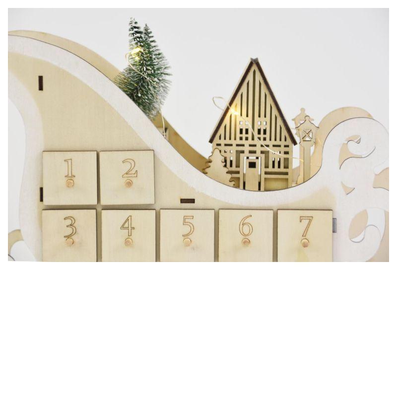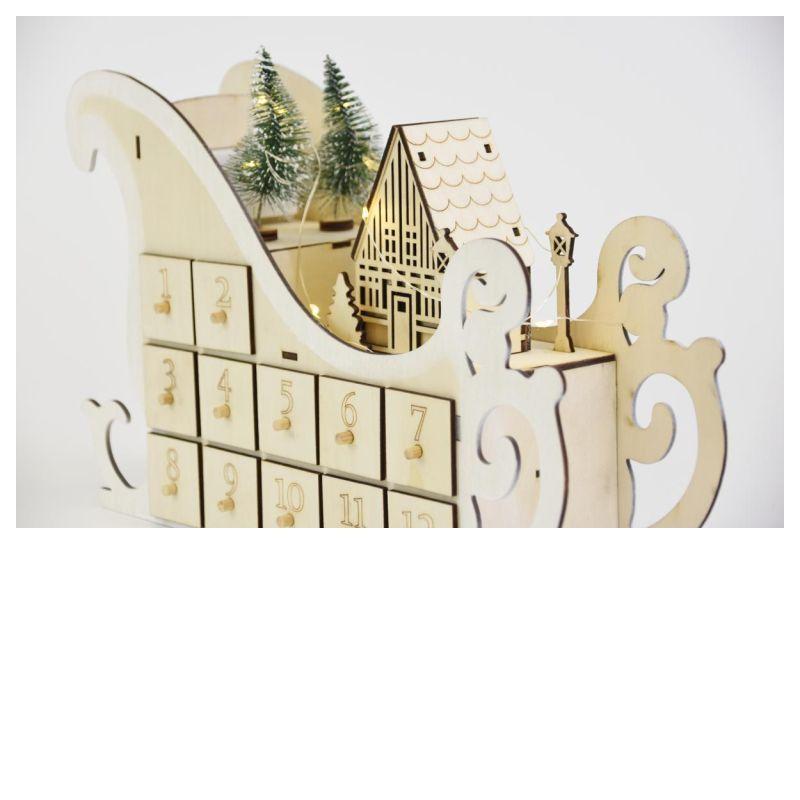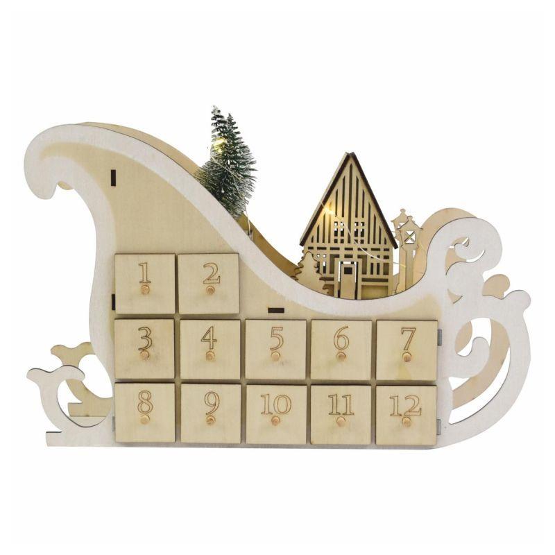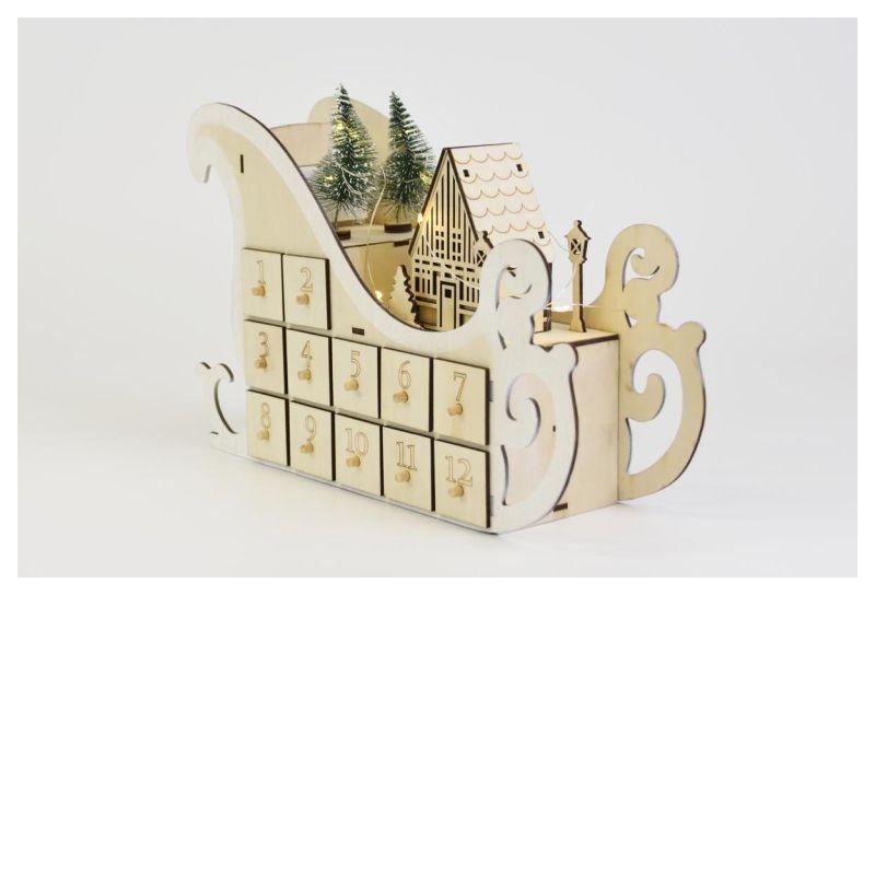 Vánoční dekorace saně s osvětlením a adventním kalendářem s 12 přihrádkami je originálním doplňkem vhodným pro umístění na parapet, skříňku, poličku, vánoční stůl apod. Teple bílé světlo LED diod doplňuje celkový dojem a vytváří příjemnou atmosféru během adventních večerů.