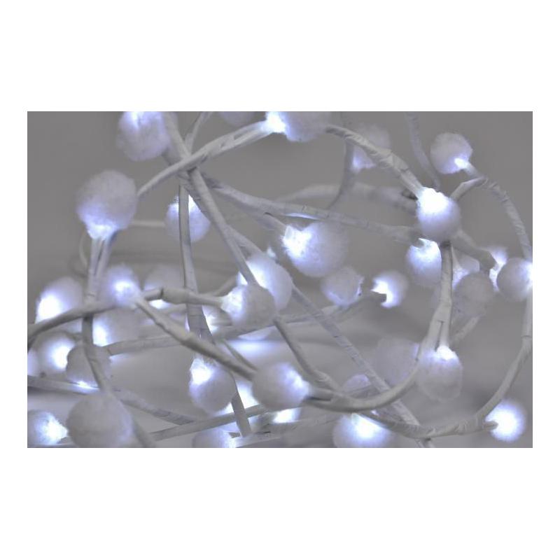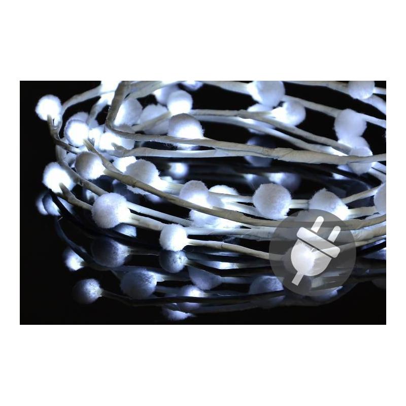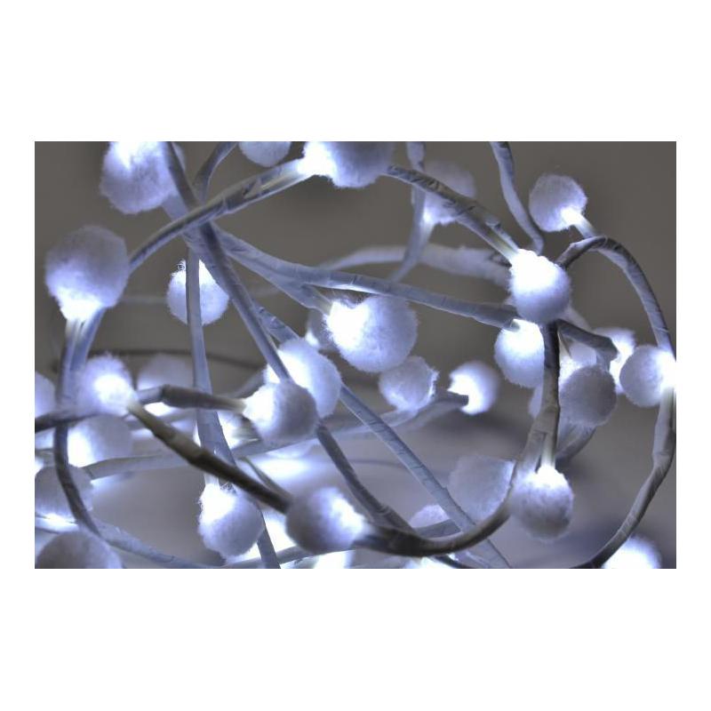 Bílý LED řetěz s kuličkami evokujícími sněhové vločky s délkou větve (světelné části) cca 1,8 m určený do vnitřních prostor.