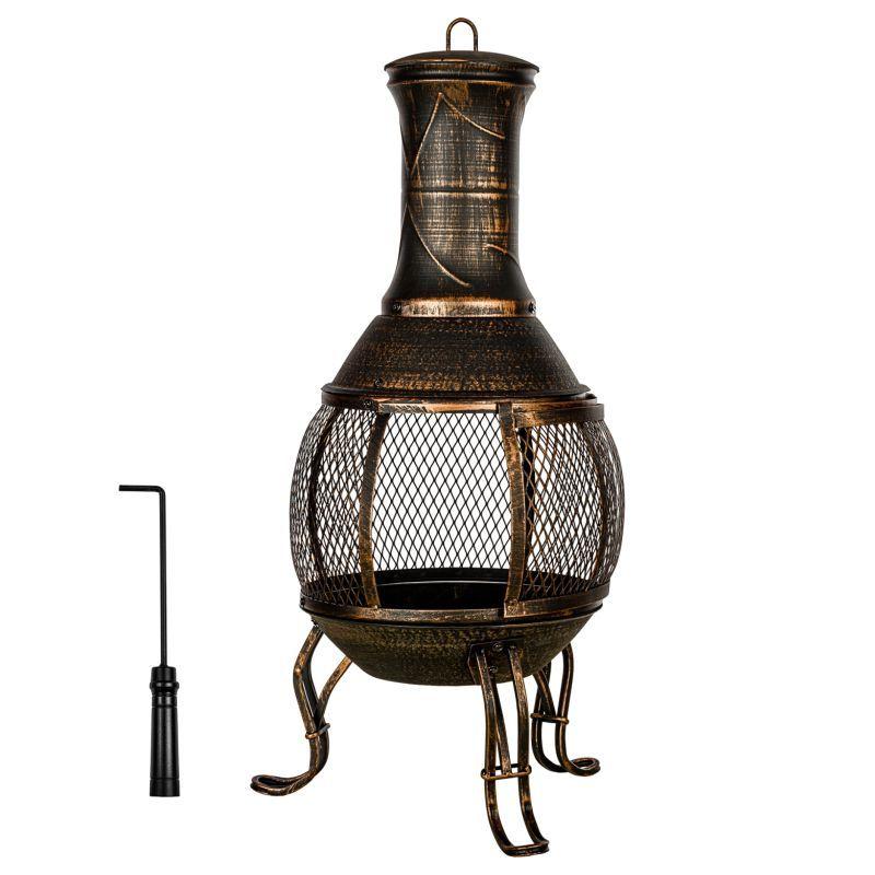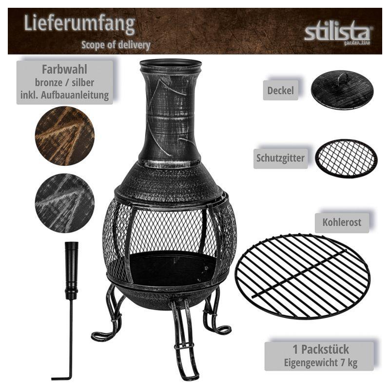Kovový venkovní samostatně stojící krb jako dělaný na terasu, pod pergolu apod. Litinové tělo krbu se po roztopení rozehřeje a uvolňuje do okolí teplo ještě po dlouhou dobu- prodlouží Vám tak sezónu letního posezení venku, vytvoří venku romantickou atmosféru, ale také umožní grilování. (součástí krbu je i grilovací mřížka, ochranná mřížka proti odletujícím horkým uhlíkům, pohrabáč a horní kryt proti dešti).